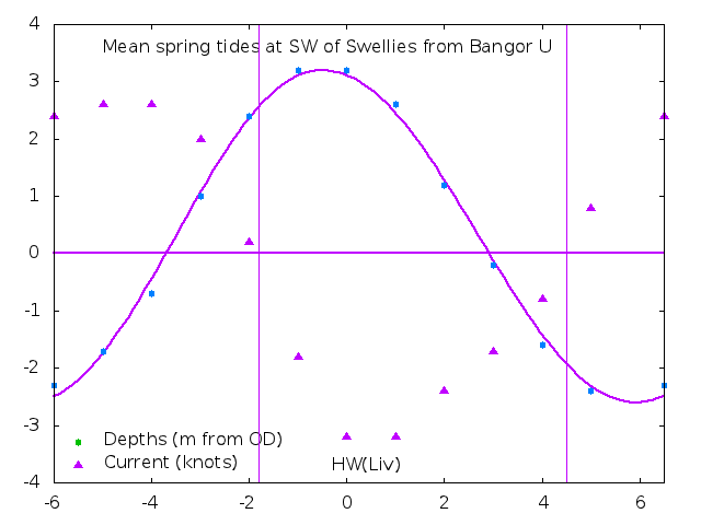Caption: From Bangor University Menai tidal model. For mean spring tides with time from Liverpool(Alfred) HW in hours for one tidal cycle. Location at SW end of Swellies, near Britannia Bridge. Green circles are depth (compared to OD) in metres with magenta curve being a sinusoidal fit. Triangles show current (positive to NE) in knots. Vertical lines at HW-1:48 and HW+4:30 show slack at that location with depths OD+2.5m and OD-1.9m respectively.