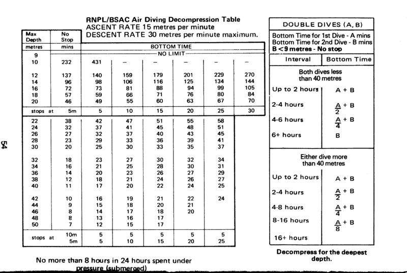 When the first dive computers became available - the DecoBrain - I saw that it used a fairly simple underlying model - by Bühlmann - of nitrogen uptake and release with 16 time-scales from 4 minutes to 10 hours. This model was published, so I used it to create my own multiple dive tables. The full version of my tables used letters like the US Navy tables. I also created a stripped down version - which listed the maximum time allowed after repeated dives with 1 hour surface interval and no decompression stops. I remember discussing this with John Thornton - who confirmed that it was very similar to what scallop divers were actually using. Some of my colleagues had the confidence in my work to use these tables themselves.