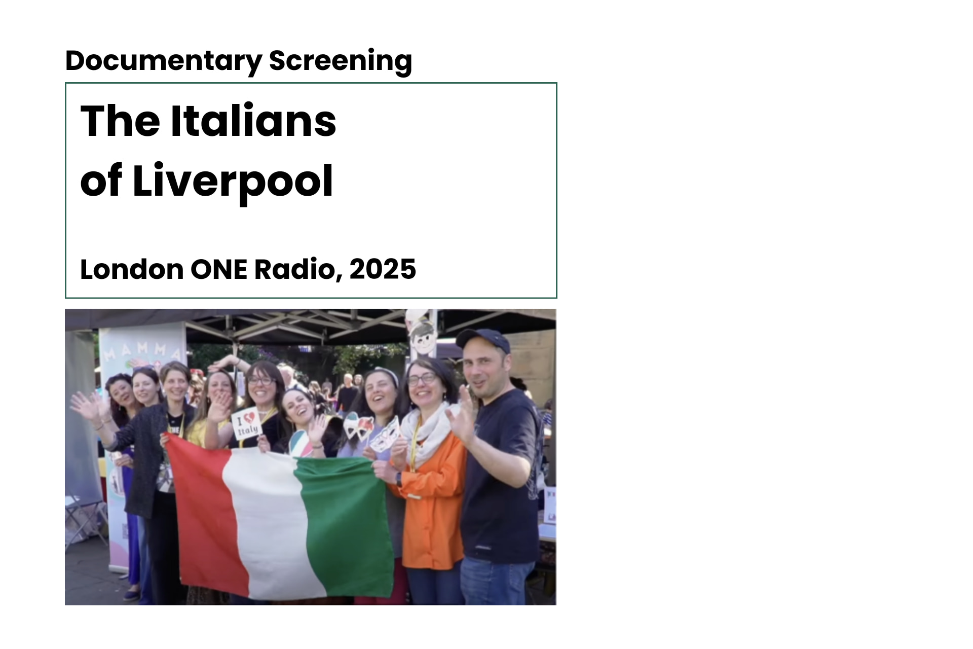The 2025 programme is a collaboration with the Dante Alighieri Society – Liverpool Branch, the Manchester Comites, a Visiting PhD student from the Università per Stranieri di Siena, a Sicilian duo (soprano and guitar), and London ONE Radio. The theme of this edition is "Italofonia: language beyond borders", with the aim of celebrating the linguistic, cultural, and social space of Italian.