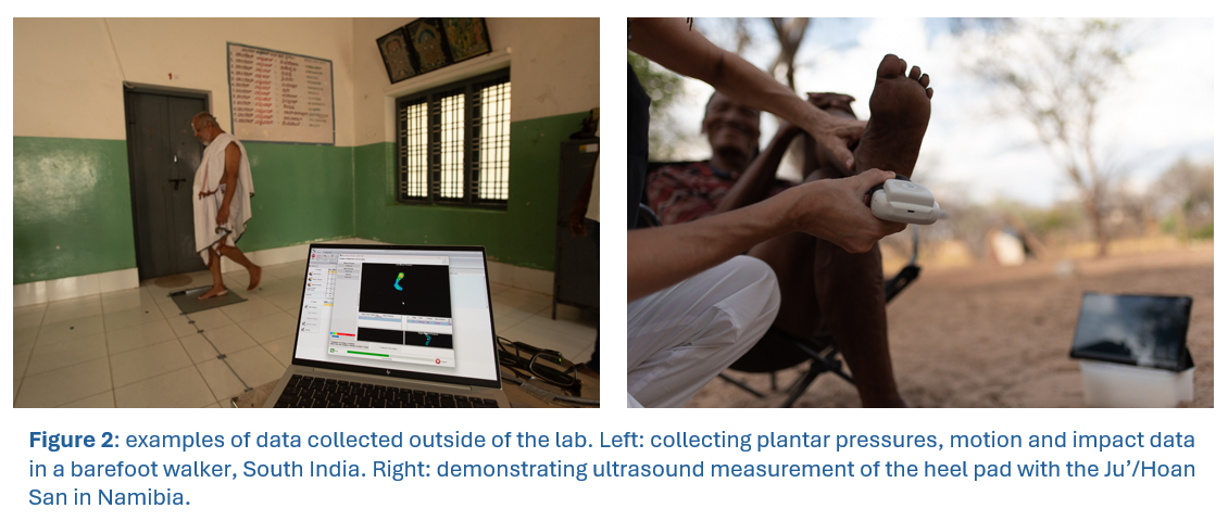 In the field, I study gait and foot function using portable equipment which includes a high-frequency ultrasound scanner, wireless IMUs (inertial measurement units) and plantar pressure plates. In many cases, this is supplemented by surveys and anthropometric measurements. We always work in a reciprocal relationship with local collaborators and volunteers.