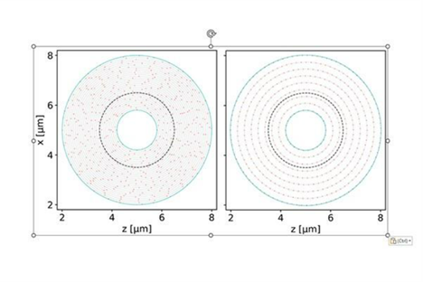 Transverse view of two targets built with 25 nm-thick CNT bundles: (Left) 535 CNT bundles are distributed more uniformly in 30 shells; (Right) 546 CNT bundles distributed less uniformly in 9 shells. The black dashed line indicates the laser spot size.
