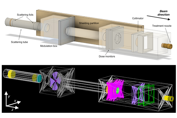 Top: 3D rendering of the treatment line at the Clatterbridge Cancer Centre. Bottom: Clatterbridge Cancer Centre treatment beamline model visualised in TOPAS. (CC BY 4.0)