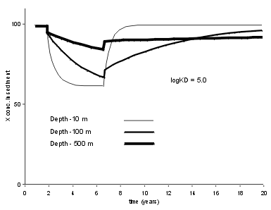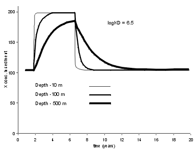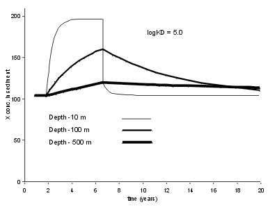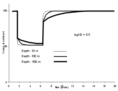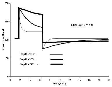 | For a less strongly bound trace element the results are different. At Log Kd = 5.0, typical for Zn, we see that a five year period of enhanced X flux leaves a good record in a shallow lake (10 m), but an indistinguishable record in the 500 m deep lake. | ![]() |