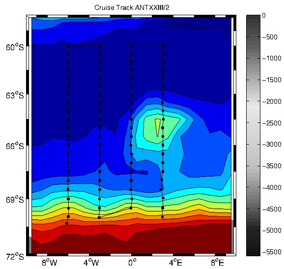 Deep Water originating in the North Atlantic is transported across the Antarctic Circumpolar Current by eddies and, after circumnavigating of the Antarctic, enters the Weddell Gyre south of Africa. As it does so it rises up from mid depth towards the surface. The separate temperature and salinity maxima, the Upper and Lower Circumpolar Deep Waters, converge to form the Warm Deep Water. Cores of this water mass on the southern flank of the eastern Weddell Gyre show a change in characteristic as they flow westward in the Lazarev Sea. Observations have been made along four meridional sections at 3oE, 0o, 3oW and 6oW between 60 and 70oS during the Polarstern Cruise ANTXXIII/2 in 2005/2006. These show that a heterogeneous series of warm and salty cores entering the region from the east both north and south of Maud Rise (65oS, 3oW) gradually merge and become more homogeneous towards the west. The gradual reduction in the variance of potential temperature on isopycnals is indicative of isopycnic mixing processes. A multiple regression technique allows diagnosis of the eddy diffusivities and thus the relative importance of isopycnic and diapycnic mixing. The method shows that the isopycnic diffusivity lies in the range 70-140 m2 s-1 and the diapycnic diffusivity reaches about 3 * 10-6 m2 s-1. Scale analysis suggests that isopycnic diffusion dominates over diapycnic diffusion in the erosion of Warm Deep Water cores. (Leach et al. 2011)